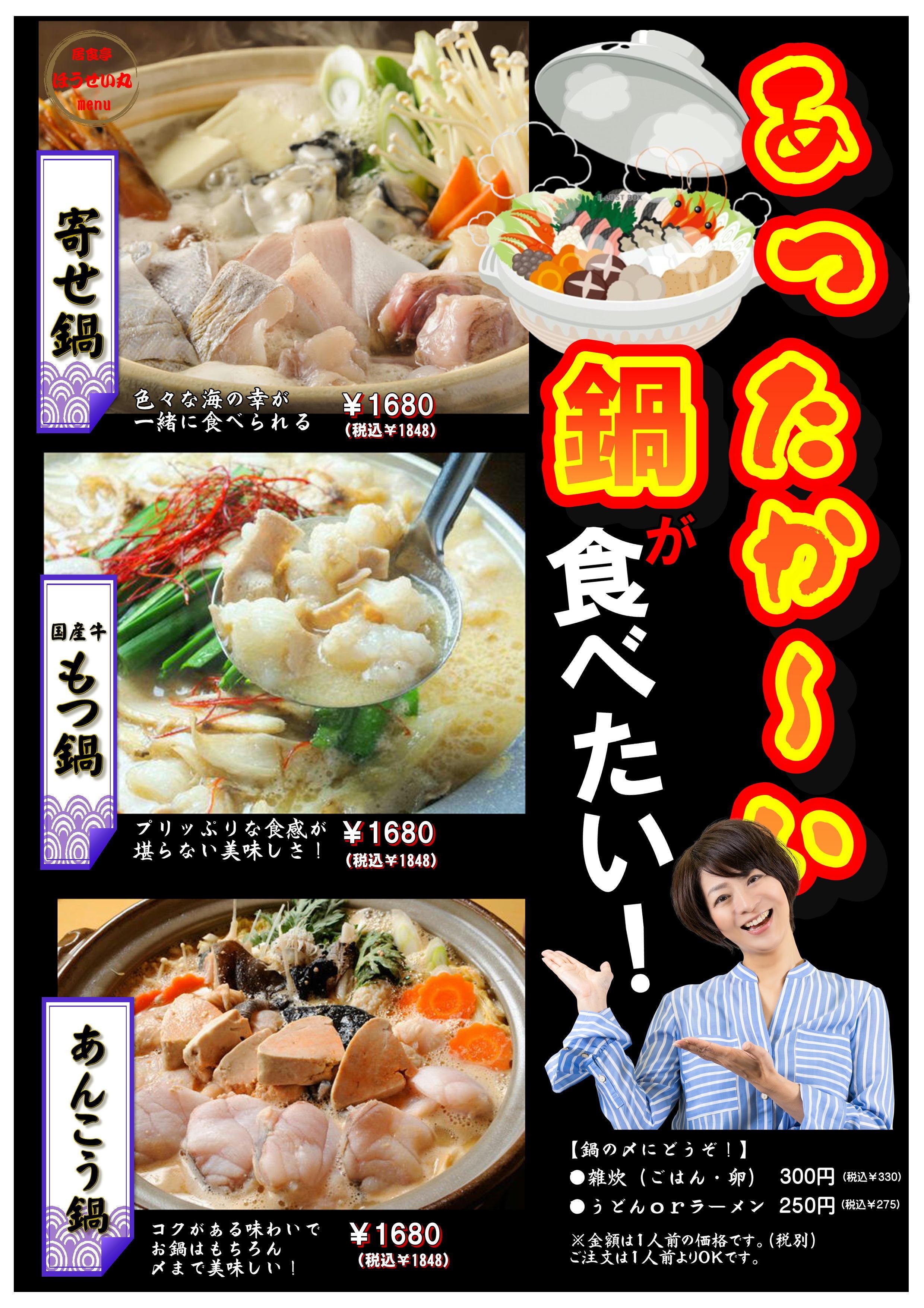 居食亭ほうせい丸では、特に人気のある鍋料理が揃っています。